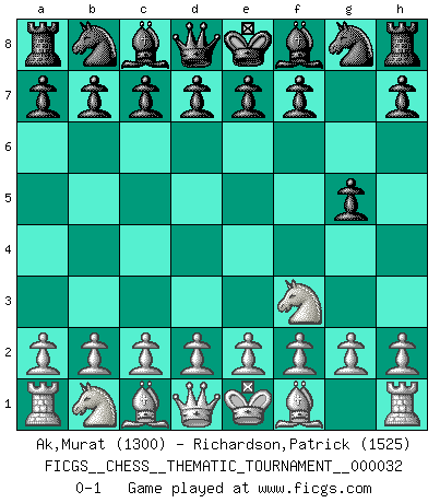 Last move : 0-1 2007 July 22 6:15:42 [Event "FICGS__CHESS__THEMATIC_TOURNAMENT__000032"] [Site "FICGS"] [Date "2007.06.12"] [Round "1"] [White "Ak,Murat"] [Black "Richardson,Patrick"] [Result "0-1"] [WhiteElo "1300"] [BlackElo "1525"] 1.Nf3 g5 0-1 This chess game has been lost on time (started : 2007.06.12 1:30:29) Reti : Herrstroem gambit Player Black won this chess game. Follow this game move after move (download)The hallmark of the artist is simplicity. (Larry Evans) Sie bekommen vielleicht den Eindruck, dass die Spitzenspieler überhaupt gar nicht so stark sind. Aber das stimmt nicht. Es ist eine Illusion. Mit einem Computer an der Seite ist es sehr leicht, Urteile zu fällen, aber wenn man alleine am Brett sitzt, sieht die Sache ganz anders aus. (Vladimir Kramnik) Debió haber existido una vez en que los hombres eran semidióses, de otra manera no hubiesen podido inventar el Ajedrez. (Gustav Schenk) Je fais ceci parce que dans cinquante coups j'obtiendrai cela; je m'appelle Mikhail Moisevitch Botvinnik. (Botvinnik) In fact if nothing is done against this teddy bear, hereby I announce that I would quit chess, rapid chess, blitz chess, postal chess, email chess, server chess and correspondence chess I will then switch to a table game where teddy bears aren't going to be seen for a while, like Poker, or Roulette, all 18+ games. (Elmer Valderrama)