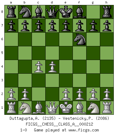 Last move : 1-0 2019 July 12 10:19:39 [Event "FICGS__CHESS__CLASS_A__000212"] [Site "FICGS"] [Date "2019.05.28"] [Round "1"] [White "Duttagupta,Aniruddha"] [Black "Vestenicky,Patrik"] [Result "1-0"] [WhiteElo "2135"] [BlackElo "2086"] 1.d4 Nf6 2.c4 1-0 This chess game has been lost on time (started : 2019.05.28 16:31:37) Queen's pawn game Player White won this chess game. Follow this game move after move (download)Chess is played with the mind and not with the hands ! (Renaud and Kahn) Das Blackmar-Diemer-Gambit verändert den ganzen Menschen! (Emil Joseph Diemer) Cualquier cambio de material en una posición debe venir por medio de un mate, una captura o promoción de Peón. (Purdy) Aux échecs, les retours au sommet sont rares : les dommages psychologiques consécutifs à une défaite sont trop sévères. (Daily Telegraph) Live, lose, and learn, by observing your opponent how to win. (Amber Steenbock)