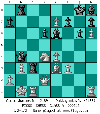 Last move : 1/2-1/2 2019 September 1 20:5:55 [Event "FICGS__CHESS__CLASS_A__000212"] [Site "FICGS"] [Date "2019.05.28"] [Round "1"] [White "Cleto Junior,Dirceu"] [Black "Duttagupta,Aniruddha"] [Result "1/2-1/2"] [WhiteElo "2189"] [BlackElo "2135"] 1.e4 c5 2.Nf3 d6 3.d4 cxd4 4.Nxd4 Nf6 5.Nc3 g6 6.Be3 Bg7 7.f3 O-O 8.Qd2 Nc6 9.Bc4 Bd7 10.O-O-O Rb8 11.Bb3 Na5 12.h4 b5 13.Kb1 Nc4 14.Bxc4 bxc4 15.g4 Qb6 16.b3 cxb3 17.cxb3 Qb7 18.h5 Qb4 19.h6 Bh8 20.g5 Rfc8 21.gxf6 Rxc3 22.fxe7 Be6 23.Rc1 1/2-1/2 Sicilian : Dragon, Yugoslav attack, 7...O-O Kingside Castling by player Black (move 7) Queenside Castling by player White (move 10) This chess game ended in a draw. Follow this game move after move (download)It is peculiar but a fact nevertheless, that gamblers in chess always have enthusiastic followers. (Botvinnik) Der Schachmeister von Heute braucht Courage, einen Killerinstinkt, Ausdauer und Arroganz. (Larry Evans) Las ideas audaces son como las piezas del Ajedrez que avanzan hacia adelante. Ellas pueden ser vencidas, pero también pueden iniciar una partida victoriosa. (Goethe) RxDa4 pat (...) There are two types of people in this world, good and bad. The good sleep better, but the bad seem to enjoy the waking hours much more. (Woody Allen)