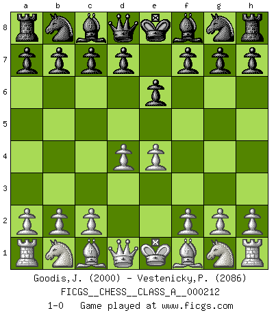 Last move : 1-0 2019 July 8 11:45:41 [Event "FICGS__CHESS__CLASS_A__000212"] [Site "FICGS"] [Date "2019.05.28"] [Round "1"] [White "Goodis,Johannes"] [Black "Vestenicky,Patrik"] [Result "1-0"] [WhiteElo "2000"] [BlackElo "2086"] 1.e4 e6 2.d4 1-0 This chess game has been lost on time (started : 2019.05.28 16:31:37) French defense Player White won this chess game. Follow this game move after move (download)Fischer is completely natural. He plays no roles. He's like a child. Very, very simple. (Zita Rajcsanyi) Ein Springer auf f6 gegen die eigene Rochadestellung ist schlimmer als ein rostiger Nagel im Knie. (Efim Bogoljubov) En el tablero, la mentira e hipocresía no sobreviven mucho. (Emanuel Lasker) Les échecs, c'est l'imagination. (David Bronstein) Treat your password like your toothbrush. Don't let anybody else use it, and get a new one every six months. (Clifford Stoll)