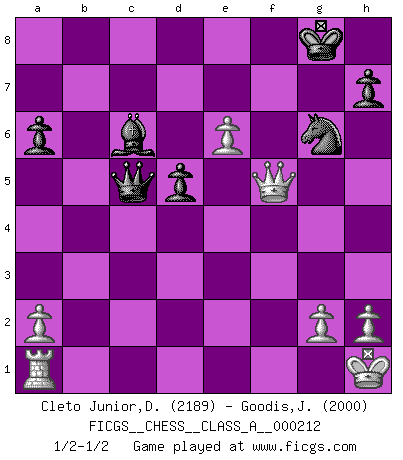 Last move : 1/2-1/2 2019 July 10 17:47:52 [Event "FICGS__CHESS__CLASS_A__000212"] [Site "FICGS"] [Date "2019.05.28"] [Round "1"] [White "Cleto Junior,Dirceu"] [Black "Goodis,Johannes"] [Result "1/2-1/2"] [WhiteElo "2189"] [BlackElo "2000"] 1.e4 e6 2.d4 d5 3.Nc3 Nf6 4.e5 Nfd7 5.f4 c5 6.Nf3 Nc6 7.Be3 a6 8.Qd2 Be7 9.dxc5 Nxc5 10.Nd4 Qc7 11.Qf2 O-O 12.Be2 Bd7 13.O-O Rac8 14.Nxe6 fxe6 15.Bxc5 g5 16.Bxe7 Nxe7 17.Qg3 Ng6 18.Qxg5 Qb6+ 19.Kh1 Rf5 20.Qg3 Qxb2 21.Nxd5 exd5 22.Bd3 Rxc2 23.Rfb1 Qc3 24.Bxc2 Qxc2 25.Rxb7 Bc6 26.Rb4 Qc5 27.Qd3 Rxf4 28.Rxf4 Nxf4 29.Qf5 Ng6 30.e6 1/2-1/2 French : Steinitz, Boleslavsky variation Kingside Castling by player Black (move 11) Kingside Castling by player White (move 13) This chess game ended in a draw. Follow this game move after move (download)The sign of a great Master is his ability to win a won game quickly and painlessly. (Irving Chernev) Ein guter Spieler hat immer Glück. (José Raúl Capablanca) Me dio la sensación de como si yo estuviera jugando en contra del mismo Ajedrez. - al estar jugando en contra de Robert Fischer (Walter Shipman) Toute estimation doit être constamment réévaluée. (Jacob Estrin) Question: Is 'This statement is paradoxical' a paradoxical statement ? Or is it a meta-paradox ? (Normajean Yates)