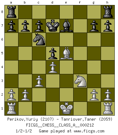 Last move : 1/2-1/2 2019 August 6 18:41:38 [Event "FICGS__CHESS__CLASS_A__000212"] [Site "FICGS"] [Date "2019.05.28"] [Round "1"] [White "Perikov,Yuriy"] [Black "Tanriover,Taner"] [Result "1/2-1/2"] [WhiteElo "2107"] [BlackElo "2059"] 1.d4 f5 2.f3 Nf6 3.e4 fxe4 4.fxe4 Nxe4 5.Nf3 d5 6.Bd3 Bf5 7.Qe2 e6 8.Nbd2 Nc6 9.c3 Be7 10.Nxe4 dxe4 11.Bxe4 Bxe4 12.Qxe4 Qd5 13.Qxd5 exd5 14.Bf4 Kd7 15.Be5 1/2-1/2 Dutch This chess game ended in a draw. Follow this game move after move (download)Even the laziest King flees wildly in the face of a double check ! (Aaron Nimzowitsch) Im Hotelzimmer gab es nur zwei Schaben. (Über die Turnierbedingungen) (Peter Swidler) Todos los Maestros de Ajedrez fueron un día unos principiantes. (Chernev) Les Echecs ne sont pas pour les âmes timides. Ils requièrent un homme entier, qui ne s'arrête pas aveuglément à ce qui a été déjà établi, mais qui tente individuellement de sonder les profondeurs du jeu. (W. Steinitz) Thibault, I ask for draw. Game 13876. - Sorry Ilmars, you won. (FICGS chat)