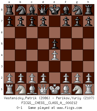 Last move : 0-1 2019 July 8 11:45:41 [Event "FICGS__CHESS__CLASS_A__000212"] [Site "FICGS"] [Date "2019.05.28"] [Round "1"] [White "Vestenicky,Patrik"] [Black "Perikov,Yuriy"] [Result "0-1"] [WhiteElo "2086"] [BlackElo "2107"] 1.e4 e5 0-1 This chess game has been lost on time (started : 2019.05.28 16:31:37) King's pawn game Player Black won this chess game. Follow this game move after move (download)Fischer was a master of clarity and a king of artful positioning. His opponents would see where he was going but were powerless to stop him. (Bruce Pandolfini) Ein Buch ist ein Spiegel; wenn ein Affe hineinsieht, so kann kein Apostel heraus gucken. (Georg Christoph Lichtenberg) Un Peón pasado aumenta su poder a medida de que el número de piezas en el tablero disminuye. (Capablanca) Vous savez, camarade Pachman, je n'éprouve pas de plaisir à être ministre, je jouerais plutôt aux échecs comme vous, ou alors ferais une révolution au Venezuela. (Che Guevara à Ludek Pachman, 'Checkmate in Prague', 1975) Art is not a thing, it is a way. (Elbert Hubbard)
