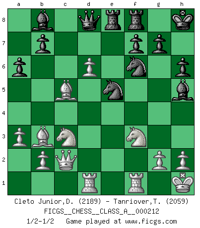 Last move : 1/2-1/2 2019 August 15 21:32:55 [Event "FICGS__CHESS__CLASS_A__000212"] [Site "FICGS"] [Date "2019.05.28"] [Round "1"] [White "Cleto Junior,Dirceu"] [Black "Tanriover,Taner"] [Result "1/2-1/2"] [WhiteElo "2189"] [BlackElo "2059"] 1.e4 e5 2.f4 d5 3.exd5 exf4 4.Nf3 Nf6 5.c4 c6 6.d4 Bb4+ 7.Nc3 cxd5 8.Bd3 O-O 9.O-O dxc4 10.Bxc4 Nc6 11.Bxf4 Bg4 12.a3 Bd6 13.Be3 Rc8 14.Ba2 Bb8 15.Kh1 Qc7 16.Qd2 Rce8 17.Bg1 Qd8 18.Bb3 a6 19.Rad1 h6 20.Qc2 Bh5 21.d5 Ne5 22.d6 Kh8 23.Bc5 1/2-1/2 KGD : Falkbeer counter-gambit Kingside Castling by player Black (move 8) Kingside Castling by player White (move 9) This chess game ended in a draw. Follow this game move after move (download)I'd rather have a Pawn than a finger. (Reuben Fine) Es war undenkbar für die Behörden, dass ein sowjetischer Großmeister auf diese Art und Weise [Fischer-Taimanov 6:0] verliert, ohne dass es eine politischer Erklärung dafür gäbe. (Mark Taimanov) A la fecha, Fischer esta simplemente un nivel arriba de todos los mejores jugadores de Ajedrez del mundo. (John Jacobs) Avec des compensations pour le matériel en plus... (Anonyme) A belief is an idea the mind possesses, an idea that possesses the mind. (Robert Oxden Bolton)