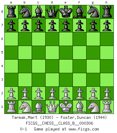 Last move : 0-1 2019 July 10 1:48:6 [Event "FICGS__CHESS__CLASS_B__000306"] [Site "FICGS"] [Date "2019.05.30"] [Round "1"] [White "Tarmak,Mart"] [Black "Foster,Duncan"] [Result "0-1"] [WhiteElo "1930"] [BlackElo "1944"] 0-1 This chess game has been lost on time (started : 2019.05.30 13:21:12) Player Black won this chess game. Follow this game move after move (download)Bobby is the most misunderstood, misquoted celebrity walking the face of this earth. (Yasser Seirawan) Ich weiss nicht was Gott gegen mich auf 1.e4 antworten würde. (Robert James Fischer) Solo existe una cosa que Fischer hace en el Ajedrez sin placer: ¡perder!. (Boris Spassky) La vie et les Echecs sont tous les deux une lutte constante. (Lasker) That's absurd. I love it. (Gregory House, House M.D.)