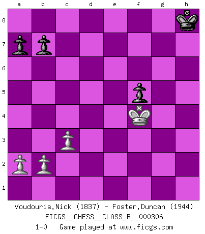 Last move : 1-0 2019 September 24 13:40:41 [Event "FICGS__CHESS__CLASS_B__000306"] [Site "FICGS"] [Date "2019.05.30"] [Round "1"] [White "Voudouris,Nick"] [Black "Foster,Duncan"] [Result "1-0"] [WhiteElo "1837"] [BlackElo "1944"] 1.d4 f5 2.h3 Nf6 3.g4 d5 4.g5 Ne4 5.Nc3 e6 6.h4 c5 7.e3 cxd4 8.exd4 Nc6 9.Nce2 Bd7 10.Nh3 Bd6 11.c3 Qc7 12.Bg2 O-O-O 13.Nhf4 h6 14.Ng6 Rh7 15.gxh6 gxh6 16.h5 Rg8 17.Bf4 Ne7 18.Bxe4 dxe4 19.Nxe7+ Rxe7 20.Qd2 Bc6 21.Bxd6 Qxd6 22.Qxh6 e3 23.Rf1 Bg2 24.Qf4 Qxf4 25.Nxf4 Bxf1 26.Kxf1 e5 27.dxe5 Rxe5 28.Rd1 Rd8 29.Re1 Rd2 30.Re2 Rd1+ 31.Re1 Rxe1+ 32.Kxe1 exf2+ 33.Kxf2 Kd7 34.h6 Re8 35.h7 Ke7 36.h8Q Rxh8 37.Ng6+ Kf7 38.Nxh8+ Kg7 39.Kf3 Kxh8 40.Kf4 1-0 Dutch, Korchnoi attack Queenside Castling by player Black (move 12) Promotion Queen by player White (move 36) 10 pieces endgame at move 36 : White KNPPP , Black KRPPP WHITE : King + 1 Knight 3 Pawns BLACK : King + 1 Rook 3 Pawns 9 pieces endgame at move 38 : White KNPPP , Black KPPP WHITE : King + 1 Knight 3 Pawns BLACK : King + 3 Pawns 8 pieces endgame at move 39 : White KPPP , Black KPPP WHITE : King + 3 Pawns BLACK : King + 3 Pawns Player White won this chess game. Follow this game move after move (download)A great player and a great example for many. His book My 60 Memorable Games had a big impact on me. It is a shame he didn't continue to enrich the world of chess with his unparalleled understanding after 1972. (Jan Timman, about Bobby Fischer's death) Schach ist ein Teil der Kultur, und wenn es mit der Kultur abwärts geht, geht es auch mit dem Schach abwärts. (Mikhail Moiseyevich Botvinik) Si el Ajedrez es una ciencia, es la mas inexacta. Si el Ajedrez es un arte, es demasiado inexacto para ser visto como tal. Si el Ajedrez es un deporte, es demasiado esotérico. Si el Ajedrez es un juego, es demasiado exigente para ser solo un juego. Si el Ajedrez es una aventura, es una muy demandante. Si el Ajedrez es una pasión, es una muy gratificante. Si el Ajedrez es la vida, es una muy triste. (Anónimo) Nous sommes les pions de la mystérieuse partie d'Echecs jouée par Dieu. Il nous déplace, nous arrête, nous pousse encore, puis nous lance un à un dans la boîte du Néant. Epitaphe sur la tombe de David Janowsky (1868-1927). Computers are like Old Testament gods; lots of rules and no mercy. (Joseph Campbell)