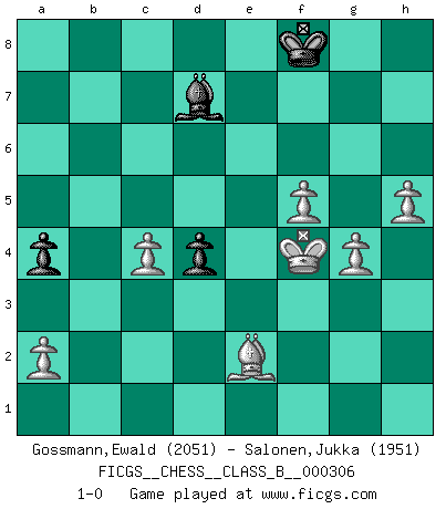 Last move : 1-0 2019 July 24 8:51:33 [Event "FICGS__CHESS__CLASS_B__000306"] [Site "FICGS"] [Date "2019.05.30"] [Round "1"] [White "Gossmann,Ewald"] [Black "Salonen,Jukka"] [Result "1-0"] [WhiteElo "2051"] [BlackElo "1951"] 1.e4 e5 2.Nf3 Nc6 3.Bb5 a6 4.Ba4 Nf6 5.O-O Be7 6.Re1 b5 7.Bb3 d6 8.h3 O-O 9.c3 Na5 10.Bc2 c5 11.d4 Qc7 12.d5 Bd7 13.b3 Nb7 14.c4 bxc4 15.bxc4 Rab8 16.Bd2 Na5 17.Bd3 g6 18.Nc3 Nh5 19.Qc2 Rb7 20.Ne2 Rfb8 21.Bc3 Bf6 22.Qd2 Bd8 23.Rac1 Nf6 24.Qe3 Be8 25.Ng3 Ba4 26.Nh2 Qe7 27.f4 Nd7 28.Ng4 h5 29.Nxh5 gxh5 30.Nh6+ Kh7 31.Nf5 Qf6 32.Qf3 Qg6 33.Nxd6 Qxd6 34.fxe5 Nxe5 35.Qxh5+ Qh6 36.Qxe5 Kg8 37.Qg3+ Qg5 38.Qf3 Nc6 39.dxc6 Bxc6 40.Re3 f5 41.Be5 Bc7 42.Qg3 Qxg3 43.Rxg3+ Kf8 44.Rf1 Bd7 45.Bxc7 Rxc7 46.Rf4 Rc6 47.Rh4 Re8 48.exf5 Rd6 49.Rh8+ Ke7 50.Re3+ Kf7 51.Rhxe8 Bxe8 52.g4 Kf6 53.h4 Kg7 54.Kf2 Kf8 55.h5 a5 56.Kg3 a4 57.Be2 Bd7 58.Rd3 Rd4 59.Rxd4 cxd4 60.Kf4 1-0 Ruy Lopez : Closed Kingside Castling by player White (move 5) Kingside Castling by player Black (move 8) Player White won this chess game. Follow this game move after move (download)He who takes the Queen's Knight's Pawn will sleep in the streets. (Anonymous) Du weisst es gibt ein Problem mit Computern und Fernschach, wenn jeder eine Rating von 2450 hat. (John Christen Knudsen) ¿Porque tengo que perder ante este idiota?. (Aron Nimzovich) Horreur, mais aussi harmonie suprême : qu'y avait-il en effet au monde en dehors des échecs ? Le brouillard, l'inconnu, le non-être... (Vladimir Nabokov) Once you start thinking you have nothing left to learn, you have everything to learn. (Steve Badget)