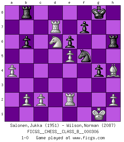 Last move : 1-0 2019 June 27 8:19:22 [Event "FICGS__CHESS__CLASS_B__000306"] [Site "FICGS"] [Date "2019.05.30"] [Round "1"] [White "Salonen,Jukka"] [Black "Wilson,Norman"] [Result "1-0"] [WhiteElo "1951"] [BlackElo "2087"] 1.e4 c5 2.Nf3 e6 3.Nc3 a6 4.d4 cxd4 5.Nxd4 Qc7 6.Be2 Nf6 7.O-O d6 8.f4 Nbd7 9.Bf3 Rb8 10.a4 b6 11.g4 h6 12.Qe2 Ng8 13.Be3 Be7 14.Rad1 g5 15.e5 dxe5 16.Ncb5 axb5 17.Nxb5 Qd8 18.fxe5 h5 19.Bc6 Nh6 20.gxh5 Kf8 21.Qd3 Kg8 22.Bxd7 Bxd7 23.Qxd7 Nf5 24.Qxd8+ Bxd8 25.Bf2 Rxh5 26.Rd7 g4 27.Nd6 Bg5 28.Re1 Bh4 29.Re2 Rh6 30.Bxh4 1-0 Sicilian defense Kingside Castling by player White (move 7) Player White won this chess game. Follow this game move after move (download)Chess is life. (Bobby Fischer) Schachspieler können ausgezeichnet Varianten am Schachbrett berechnen, aber nicht im realen Leben. Zu stark ist der Individualismus im Schach ausgeprägt, und für viele ist ein kleiner momentaner persönlicher Vorteil wichtiger als ein weit größerer Vorteil von morgen. (Anatoly Karpov) Yo nunca en mi vida he jugado la Defensa Francesa, que viene siendo la más aburrida de todas las Aperturas. (Wilhelm Steinitz) Shah mat. Le roi est mort. Cri de fierté d'un joueur venant de terrasser son adversaire, courtoisement, sans effusion de sang. In my experience, there's no such thing as luck. (Obi-Wan Kenobi in Star Wars ep.4)
