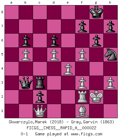 Last move : 0-1 2007 September 23 12:6:7 [Event "FICGS__CHESS__RAPID_A__000022"] [Site "FICGS"] [Date "2007.06.13"] [Round "1"] [White "Skwarczylo,Marek"] [Black "Gray,Garvin"] [Result "0-1"] [WhiteElo "2018"] [BlackElo "1863"] 1.d4 Nf6 2.Nf3 e6 3.c4 c5 4.d5 exd5 5.cxd5 d6 6.Nc3 g6 7.g3 Bg7 8.Bg2 O-O 9.O-O Re8 10.Nd2 Nbd7 11.h3 Nb6 12.a4 a5 13.Qb3 Bd7 14.Nc4 Nxc4 15.Qxc4 Qb6 16.Nb5 Bxb5 17.axb5 Qc7 18.Ra2 Nd7 19.b3 Nb6 20.Qd3 a4 21.Bf4 axb3 22.Qxb3 Rxa2 23.Qxa2 Be5 24.e4 Bxf4 25.gxf4 Ra8 26.Qb2 Nd7 27.Qc2 Ra3 28.Rb1 c4 29.Rc1 c3 30.Bf1 Qc5 31.Qd3 Qb4 32.Qe3 b6 33.Rc2 Nf6 34.f3 Qb3 35.Qc1 Qa4 36.Rf2 Rb3 37.Qe3 c2 38.Qc1 Rc3 39.Kg2 Nh5 40.f5 Qb3 0-1 Queen's pawn game Kingside Castling by player Black (move 8) Kingside Castling by player White (move 9) Player Black won this chess game. Follow this game move after move (download)As one by one I mowed them down, my superiority soon became apparent. (Jose Capablanca) Wir irren allesamt, nur jeder irrt anders. (Georg Christoph Lichtenberg) Después de la respuesta de las negras a 1.e4 con 1..e5, se quedan siempre tratando de entrar dentro del juego. (Howard Staunton) Comme les marins qui ont mille raisons différentes d'aller en mer, les joueurs d'échecs en ont tout autant avant de s'installer devant une table et jouer... (Vincent Bertignac, philosophe) Art is not a thing, it is a way. (Elbert Hubbard)