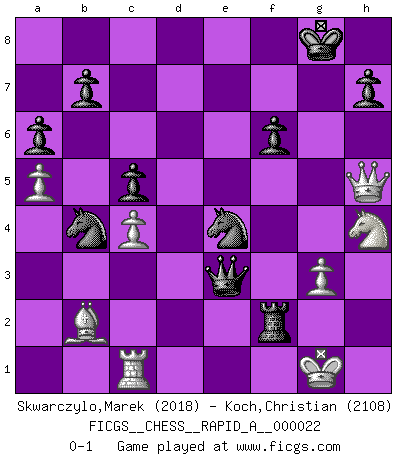 Last move : 0-1 2007 June 27 8:28:51 [Event "FICGS__CHESS__RAPID_A__000022"] [Site "FICGS"] [Date "2007.06.13"] [Round "1"] [White "Skwarczylo,Marek"] [Black "Koch,Christian"] [Result "0-1"] [WhiteElo "2018"] [BlackElo "2108"] 1.d4 Nf6 2.Nf3 d5 3.c4 dxc4 4.e3 e6 5.Bxc4 c5 6.O-O a6 7.a4 Nc6 8.Nc3 Be7 9.d5 exd5 10.Nxd5 O-O 11.Nxe7+ Qxe7 12.b3 Rd8 13.Qe2 Be6 14.Bb2 Ne4 15.Rfd1 Bxc4 16.bxc4 Qe6 17.Rxd8+ Rxd8 18.a5 f6 19.h4 Qd6 20.h5 Qd3 21.Kf1 Nb4 22.h6 gxh6 23.Rc1 h5 24.g3 Qb3 25.Nh4 Rd2 26.Qxh5 Rxf2+ 27.Kg1 Qxe3 0-1 Queen's pawn game Kingside Castling by player White (move 6) Kingside Castling by player Black (move 10) Player Black won this chess game. Follow this game move after move (download)My style is somewhere between that of Tal and Petrosian. (Reshevsky) Ein Großmeister muß tausende Partien in seinem Kopf speichern, denn diese sind für Ihn, was die Worte der Muttersprache für gewöhnliche Leute sind, oder Noten für Musiker... (Garry Kasparov) La vida es como el Ajedrez, con lucha, competición y eventos buenos y malos. (Benjamin Franklin) Shah mat. Le roi est mort. Cri de fierté d'un joueur venant de terrasser son adversaire, courtoisement, sans effusion de sang. Train yourself to let go of everything you fear to lose. (Master Yoda in Star Wars ep.3)
