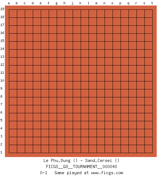 Last move : 0-1 2019 July 1 22:21:16 [Event "FICGS__GO__TOURNAMENT__000040"] [Site "FICGS"] [Date "2019.06.01"] [Round "1"] [Black "Le Phu,Dung"] [White "Sand,Cersei"] [Result "0-1"] 0-1 This go game has been lost on time (started : 2019.06.01 13:59:42) Here are the names of the openings (joseki) played in the four corners : Player White won this Go (weiqi, baduk) game. Follow this game move after move (download)Territory really exists only in the end. (Pierre Audouard) If we knew what we were doing, we would not call it research. (Albert Einstein)
