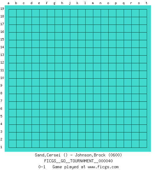 Last move : 0-1 2019 July 1 22:21:16 [Event "FICGS__GO__TOURNAMENT__000040"] [Site "FICGS"] [Date "2019.06.01"] [Round "1"] [Black "Sand,Cersei"] [White "Johnson,Brock"] [Result "0-1"] [Rating 2 "0600"] 0-1 This go game has been lost on time (started : 2019.06.01 13:59:42) Here are the names of the openings (joseki) played in the four corners : Player White won this Go (weiqi, baduk) game. Follow this game move after move (download)The comb formation is alive. (Anonymous) For peace of mind, resign as general manager of the universe. (Douglas Adams)