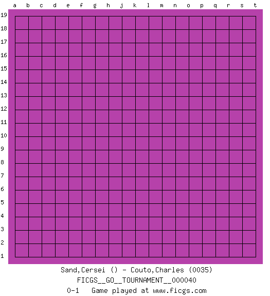 Last move : 0-1 2019 July 1 22:21:16 [Event "FICGS__GO__TOURNAMENT__000040"] [Site "FICGS"] [Date "2019.06.01"] [Round "1"] [Black "Sand,Cersei"] [White "Couto,Charles"] [Result "0-1"] [Rating 2 "0035"] 0-1 This go game has been lost on time (started : 2019.06.01 13:59:42) Here are the names of the openings (joseki) played in the four corners : Player White won this Go (weiqi, baduk) game. Follow this game move after move (download)Learning josekis by heart is useless if you don't try departing from them. (Pierre Audouard) I teach you to lie, cheat and steal, and as soon as my back's turned you wait in line ? (Gregory House, House M.D.)