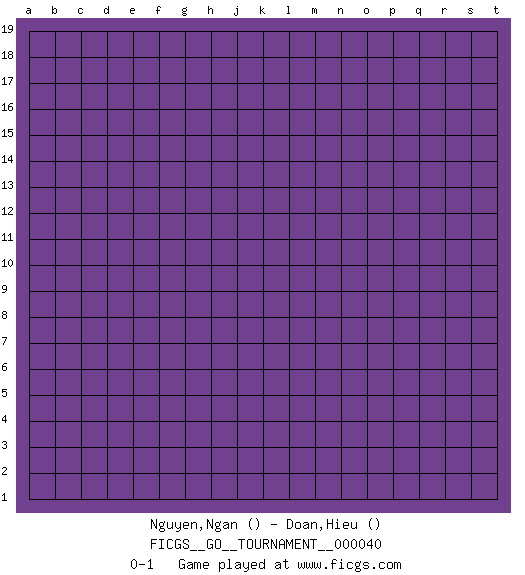 Last move : 0-1 2019 July 1 22:21:16 [Event "FICGS__GO__TOURNAMENT__000040"] [Site "FICGS"] [Date "2019.06.01"] [Round "1"] [Black "Nguyen,Ngan"] [White "Doan,Hieu"] [Result "0-1"] 0-1 This go game has been lost on time (started : 2019.06.01 13:59:42) Here are the names of the openings (joseki) played in the four corners : Player White won this Go (weiqi, baduk) game. Follow this game move after move (download)Pon-nuki is worth thirty points. (Anonymous) Sometimes it pays to stay in bed in Monday, rather than spending the rest of the week debugging Monday's code. (Dan Salomon)