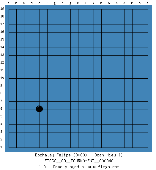 Last move : 1-0 2019 July 1 22:21:16 [Event "FICGS__GO__TOURNAMENT__000040"] [Site "FICGS"] [Date "2019.06.01"] [Round "1"] [Black "Bochatay,Felipe"] [White "Doan,Hieu"] [Result "1-0"] [Rating 1 "0000"] 1.e6 1-0 This go game has been lost on time (started : 2019.06.01 13:59:42) Here are the names of the openings (joseki) played in the four corners : Corner d4 : e6 1-0 This joseki is unknown. A weak or weird move has probably been played in this corner. Player Black won this Go (weiqi, baduk) game. Follow this game move after move (download)In opponents' sphere of influence, avoid sharp conflict, don't move too deep. (Otake Hideo, 9p) Experience is the name we all give to our mistakes. (Oscar Wilde)