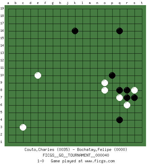 Last move : 1-0 2019 August 1 8:39:49 [Event "FICGS__GO__TOURNAMENT__000040"] [Site "FICGS"] [Date "2019.06.01"] [Round "1"] [Black "Couto,Charles"] [White "Bochatay,Felipe"] [Result "1-0"] [Rating 1 "0035"] [Rating 2 "0000"] 1.q16 c3 2.q4 e10 3.k16 o9 4.p10 o8 5.q8 q7 6.r7 r6 7.r8 s8 8.s7 1-0 This go game has been lost on time (started : 2019.06.01 13:59:42) Here are the names of the openings (joseki) played in the four corners : Corner q4 : q4 o9 Hoshi (Hwajeom, Seongjeom, Xingwei`) 4-4 Point. The star or hoshi (4-4) point, emphasizing influence at the potential expense of territory. Player Black won this Go (weiqi, baduk) game. Follow this game move after move (download)Conservative and slow will win. Believe it ! (Anonymous) I live to kill Traxler counterattack. (Ilmars Cirulis)