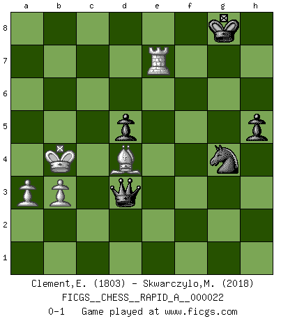 Last move : 0-1 2007 September 9 21:5:4 [Event "FICGS__CHESS__RAPID_A__000022"] [Site "FICGS"] [Date "2007.06.13"] [Round "1"] [White "Clement,Etienne"] [Black "Skwarczylo,Marek"] [Result "0-1"] [WhiteElo "1803"] [BlackElo "2018"] 1.Nf3 Nf6 2.g3 b6 3.Bg2 Bb7 4.O-O e6 5.d4 Be7 6.Nc3 O-O 7.Bf4 d6 8.Qd3 c5 9.dxc5 bxc5 10.e4 Nc6 11.Rfd1 Qb6 12.b3 Nb4 13.Qe2 Ba6 14.Qd2 Rad8 15.a3 Nc6 16.Qe1 Bb7 17.Na4 Qa6 18.Bf1 Qa5 19.Nc3 Qc7 20.Nb5 Qb8 21.Bd3 a6 22.Nc3 Nd4 23.Nxd4 cxd4 24.Na4 Nd7 25.Qe2 e5 26.Bd2 f5 27.exf5 Qa8 28.Re1 Bf3 29.Qf1 e4 30.Bc4+ d5 31.Bxa6 Rxf5 32.Qb5 Nf6 33.Nb6 Qb8 34.Qc6 Kh8 35.Nc8 Rh5 36.Bf4 Ng4 37.Be2 Rxh2 38.Bxf3 exf3 39.Rxe7 Rg2+ 40.Kf1 Qxc8 41.Qxc8 Rxc8 42.Rc1 Rxf2+ 43.Ke1 h5 44.Kd1 Rfxc2 45.Rxc2 Rxc2 46.Kxc2 f2 47.Bh6 f1Q 48.Bxg7+ Kg8 49.Bxd4 Qg2+ 50.Kc3 Qxg3+ 51.Kb4 Qd3 0-1 Reti Opening Kingside Castling by player White (move 4) Kingside Castling by player Black (move 6) Promotion Queen by player Black (move 47) 10 pieces endgame at move 50 : White KRBPP , Black KQNPP WHITE : King + 1 Rook 1 Bishop 2 Pawns BLACK : King + 1 Queen 1 Knight 2 Pawns Player Black won this chess game. Follow this game move after move (download)Everything is in a state of flux, and this includes the world of Chess. (Mikhail Botvinnik) Ich verstehe mehr vom Schach als irgendein anderer lebender Meister. (José Raúl Capablanca) Robert Fischer es la ley hacia si mismo. (Larry Evans) Le jeu d'échecs est comme rejeté hors du temps. (Antoine de Saint-Exupéry) Philosophers use a language that is already deformed as though by shoes that are too tight. (Ludwig Wittgenstein)