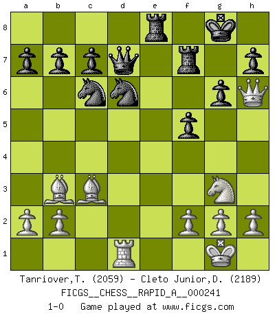 Last move : 1-0 2019 August 7 18:30:13 [Event "FICGS__CHESS__RAPID_A__000241"] [Site "FICGS"] [Date "2019.06.05"] [Round "1"] [White "Tanriover,Taner"] [Black "Cleto Junior,Dirceu"] [Result "1-0"] [WhiteElo "2059"] [BlackElo "2189"] 1.e4 e6 2.d4 d5 3.Nc3 Bb4 4.exd5 exd5 5.Bd3 Nc6 6.Nf3 Nge7 7.O-O O-O 8.Ne2 Bg4 9.Ng3 Bxf3 10.Qxf3 Nxd4 11.Qh5 g6 12.Qh4 Ndc6 13.Bg5 f5 14.Rad1 Bd6 15.c4 Qd7 16.cxd5 Ne5 17.Bc2 Nf7 18.Bf6 Rae8 19.Bc3 Nc8 20.Rfe1 Be5 21.Rxe5 Nxe5 22.d6 Nxd6 23.Bb3+ Rf7 24.Qf4 Nc6 25.Qh6 1-0 French : Winawer (Nimzovich) variation Kingside Castling by player White (move 7) Kingside Castling by player Black (move 7) Player White won this chess game. Follow this game move after move (download)I know people who have all the will in the world, but still can't play good Chess. (Bobby Fischer) Meine Liebe ist Schach, Schach, Schach. Ich muss jeden Tag Schach spielen, deshalb fühle ich mich so stark. (Miguel Najdorf) Yo creo que el Ajedrez posee una magia que es también una ayuda en la edad avanzada. Una rodilla reumática es olvidada durante una partida de Ajedrez y otros eventos pueden parecer algo sin importancia comparada a una catástrofe en el tablero de Ajedrez. (Vlastimil Hort) On n'a jamais que l'âge auquel on a commence à jouer aux échecs car après on cesse de vieillir. (Capablanca) May the force be with you. (Han Solo in Star Wars ep.4)