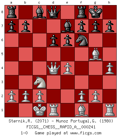 Last move : 1-0 2019 July 19 23:3:36 [Event "FICGS__CHESS__RAPID_A__000241"] [Site "FICGS"] [Date "2019.06.05"] [Round "1"] [White "Sternik,Ryszard"] [Black "Munoz Portugal,Guillermo"] [Result "1-0"] [WhiteElo "2071"] [BlackElo "1980"] 1.e4 c5 2.Nf3 Nc6 3.d4 cxd4 4.Nxd4 Nf6 5.Nc3 d6 6.Bg5 e6 7.Qd2 Be7 8.O-O-O Nxd4 9.Qxd4 O-O 10.h4 1-0 This chess game has been lost on time (started : 2019.06.05 17:56:6) Sicilian defense Queenside Castling by player White (move 8) Kingside Castling by player Black (move 9) Player White won this chess game. Follow this game move after move (download)Chess makes man wiser and clear-sighted. (Vladimir Putin) Um dein Spiel zu verbessern musst du zuallererst das Endspiel studieren, denn diese kann unabhängig studiert werden. Die Eröffnung und das Mittelspiel müssen immer in Bezug gesetzt werden zum Endspiel. (José Raúl Capablanca) El Ajedrez es imaginación. (David Bronstein) La victoire dans une partie d'Echecs appartient la plupart du temps à celui qui voit un peu plus loin que l'adversaire. (Lasker) Convictions are more dangerous enemies of truth than lies. (Friedrich Nietzsche)
