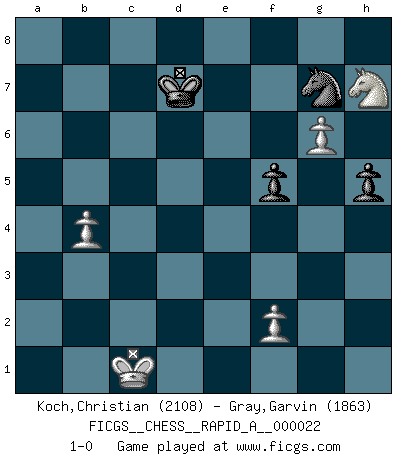 Last move : 1-0 2007 September 5 5:10:12 [Event "FICGS__CHESS__RAPID_A__000022"] [Site "FICGS"] [Date "2007.06.13"] [Round "1"] [White "Koch,Christian"] [Black "Gray,Garvin"] [Result "1-0"] [WhiteElo "2108"] [BlackElo "1863"] 1.e4 Nf6 2.e5 Nd5 3.d4 d6 4.Nf3 g6 5.Bc4 Nb6 6.Bb3 Bg7 7.Ng5 d5 8.h4 Nc6 9.Nc3 Bf5 10.g4 Bc8 11.Be3 f6 12.exf6 exf6 13.Nh3 Be6 14.Nf4 Qd7 15.Rg1 O-O-O 16.Na4 Nxa4 17.Bxa4 Rhe8 18.Qf3 f5 19.g5 Kb8 20.O-O-O a6 21.c3 Bf7 22.h5 b5 23.Bc2 b4 24.Ba4 bxc3 25.Qe2 Bxd4 26.Qxa6 Bb6 27.Bxb6 cxb6 28.Qxb6+ Qb7 29.Qxb7+ Kxb7 30.bxc3 gxh5 31.Bb3 Re4 32.Nxd5 Re2 33.Nf6 Bxb3 34.Rxd8 Rc2+ 35.Kb1 Nxd8 36.axb3 Rxc3 37.Nxh7 Ne6 38.g6 Ng7 39.Re1 Kc8 40.Rc1 Rxc1+ 41.Kxc1 Kd7 42.b4 1-0 Alekhine's defense : Modern, Fianchetto variation Queenside Castling by player Black (move 15) Queenside Castling by player White (move 20) 10 pieces endgame at move 40 : White KNPPP , Black KRNPP WHITE : King + 1 Knight 3 Pawns BLACK : King + 1 Rook 1 Knight 2 Pawns 9 pieces endgame at move 41 : White KNPPP , Black KNPP WHITE : King + 1 Knight 3 Pawns BLACK : King + 1 Knight 2 Pawns Player White won this chess game. Follow this game move after move (download)There must have been a time when men were demigods, or they could not have invented Chess. (Gustav Schenk) Jeder leidlich begabte Spieler, er braucht keineswegs hervorragend veranlagt zu sein, kann es zum Meister bringen. Aber das ist ja auch gar nicht nötig! Der richtige Standpunkt ist es, zu seinem Vergnügen zu spielen, und man glaube ja nicht, dass der Genuss proportional dem Können sei. (Siegbert Tarrasch) Yo nunca en mi vida he jugado la Defensa Francesa, que viene siendo la más aburrida de todas las Aperturas. (Wilhelm Steinitz) Vous m'avez demandé de vous exposer quel est le fondement de la prière. Je ne fais que préparer les pièces du jeu sur la table... Nous sera-t-il permis d'en adopter les règles et si nous les appliquons scrupuleusement nous ne tarderons pas à faire mat le Roi divin ! Il ne pourra échapper à nos mains. (Sainte Thérèse d'Avila, Chemin de perfection) Always remember that you are unique; just like everyone else. (Unknown)