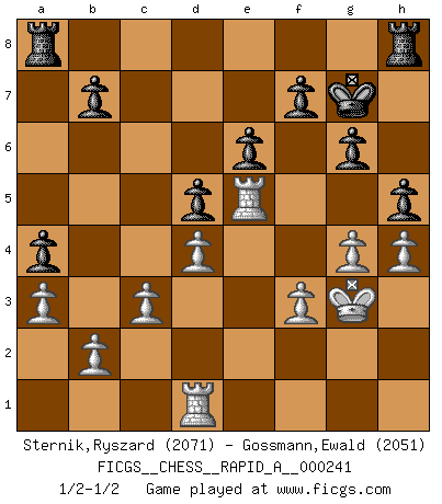 Last move : 1/2-1/2 2019 July 4 22:28:14 [Event "FICGS__CHESS__RAPID_A__000241"] [Site "FICGS"] [Date "2019.06.05"] [Round "1"] [White "Sternik,Ryszard"] [Black "Gossmann,Ewald"] [Result "1/2-1/2"] [WhiteElo "2071"] [BlackElo "2051"] 1.e4 e6 2.d4 d5 3.Nc3 Nf6 4.Bg5 dxe4 5.Nxe4 Be7 6.Bxf6 Bxf6 7.Nf3 Bd7 8.Bd3 Bc6 9.c3 g6 10.O-O Bg7 11.Qc2 Nd7 12.Rad1 a5 13.Rfe1 O-O 14.h4 Nf6 15.Ne5 Bxe4 16.Bxe4 Nxe4 17.Qxe4 h5 18.g3 a4 19.f3 c6 20.Kg2 Qd5 21.Qxd5 cxd5 22.a3 Bxe5 23.Rxe5 Kg7 24.g4 Rh8 25.Kg3 1/2-1/2 French : Burn variation Kingside Castling by player White (move 10) Kingside Castling by player Black (move 13) This chess game ended in a draw. Follow this game move after move (download)It is not a move, even the best move that you must seek, but a realizable plan. (Eugene Znosko-Borovsky) Gott hat gewollt, dass ich Champion werde. (Surab Azmajparaschvili) Durante una competencia de Ajedrez, un Maestro de Ajedrez deberá ser una combinación de presa de caza y un Monge. (Alexander Alekhine) La menace est plus forte que l'exécution. (Aaron Nimzovitch) Those parts of the system that you can hit with a hammer (not advised) are called hardware; those program instructions that you can only curse at are called software. (Anonymous)
