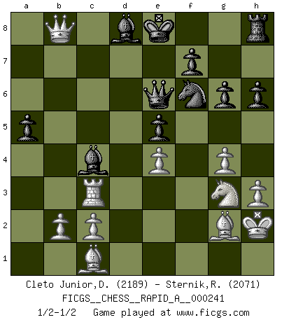 Last move : 1/2-1/2 2019 July 16 18:40:7 [Event "FICGS__CHESS__RAPID_A__000241"] [Site "FICGS"] [Date "2019.06.05"] [Round "1"] [White "Cleto Junior,Dirceu"] [Black "Sternik,Ryszard"] [Result "1/2-1/2"] [WhiteElo "2189"] [BlackElo "2071"] 1.e4 c5 2.Nf3 d6 3.d4 cxd4 4.Nxd4 Nf6 5.Nc3 a6 6.h3 e5 7.Nde2 b5 8.g4 Bb7 9.Bg2 h6 10.Ng3 Nbd7 11.Be3 Nb6 12.O-O Nc4 13.Bc1 Nb6 14.a4 Nxa4 15.Nxa4 bxa4 16.Rxa4 g6 17.f4 Be7 18.Rb4 Rb8 19.Kh2 a5 20.Rb5 Ba6 21.Rxb8 Qxb8 22.Rf3 Bb5 23.Qd2 Qc7 24.fxe5 dxe5 25.Qf2 Qd6 26.Qa7 Bd8 27.Rb3 Bc4 28.Qb8 Qe6 29.Rc3 1/2-1/2 Sicilian : Najdorf, Adams attack Kingside Castling by player White (move 12) This chess game ended in a draw. Follow this game move after move (download)Man is a frivolous, a specious creature, and like a Chess player, cares more for the process of attaining his goal than for the goal itself. (Dostoyevsky) Wenn Dein Gegner dir ein Remis anbietet, versuch herauszufinden, weshalb er glaubt schlechter zu stehen. (Nigel Short) Tu eres para mi la Reina en d8 y yo soy el Peón en d7!!. (GM Eduard Gufeld) A ce moment-là, je menaçais de comprendre la position ! (Clément L'Heureux) The only difference between a tax man and a taxidermist is that the taxidermist leaves the skin. (Mark Twain)