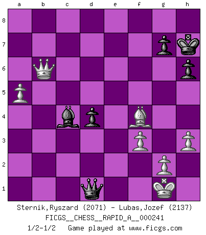 Last move : 1/2-1/2 2019 July 23 20:1:44 [Event "FICGS__CHESS__RAPID_A__000241"] [Site "FICGS"] [Date "2019.06.05"] [Round "1"] [White "Sternik,Ryszard"] [Black "Lubas,Jozef"] [Result "1/2-1/2"] [WhiteElo "2071"] [BlackElo "2137"] 1.e4 e5 2.Nf3 Nc6 3.Bb5 Nf6 4.O-O Nxe4 5.d4 Be7 6.Qe2 f5 7.dxe5 O-O 8.Nc3 Nxc3 9.Qc4+ Kh8 10.Qxc3 a6 11.Ba4 b5 12.Bb3 b4 13.Qd3 Na5 14.Bd5 c6 15.Bb3 Nxb3 16.axb3 h6 17.Nd4 a5 18.c3 Qc7 19.Re1 d5 20.e6 bxc3 21.bxc3 Rf6 22.b4 c5 23.Nxf5 Bxe6 24.Nxe7 Qxe7 25.Rxa5 Rxa5 26.bxa5 Qc7 27.Qa6 Bf5 28.Qa8+ Kh7 29.Re8 Re6 30.Rxe6 Bxe6 31.Qa6 Qe5 32.Bd2 d4 33.cxd4 cxd4 34.h3 Qe4 35.Qb6 Bc4 36.f3 Qd3 37.Bf4 Qd1+ 1/2-1/2 Ruy Lopez : Open Berlin defense, 5...Be7 Kingside Castling by player White (move 4) Kingside Castling by player Black (move 7) This chess game ended in a draw. Follow this game move after move (download)Of all my Russian books, the defense contains and diffuses the greatest 'warmth' which may seem odd seeing how supremely abstract Chess is supposed to be. (Vladimir Nabokov) Der Traum, für den ich lebe, ist der von einem freien Russland. Viele mögen sagen: Russland hat doch ein Parlament, einen gewählten Präsidenten. Aber ich spüre, dass in meiner Heimat die Angst wiederkehrt. Eine Angst, sich frei zu äußern, bestimmte Dinge zu tun (Garry Kasparov) El jugador táctico sabe que hacer cuando hay algo que hacer; mientras que el estratega sabe que hacer cuando no hay nada que hacer. (Gerald Abrahams) Les Echecs mettent en conflit, non pas deux intelligences, mais deux volontés. (Lasker) Internal peace cannot coexist with external war. (Don Groves)