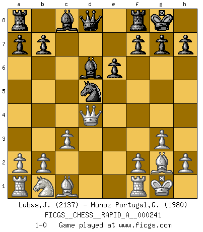 Last move : 1-0 2019 July 19 10:5:39 [Event "FICGS__CHESS__RAPID_A__000241"] [Site "FICGS"] [Date "2019.06.05"] [Round "1"] [White "Lubas,Jozef"] [Black "Munoz Portugal,Guillermo"] [Result "1-0"] [WhiteElo "2137"] [BlackElo "1980"] 1.e4 c5 2.c3 Nf6 3.e5 Nd5 4.Nf3 d6 5.exd6 e6 6.d4 cxd4 7.Nxd4 Bxd6 8.g3 Nc6 9.Bg2 Nxd4 10.Qxd4 O-O 11.O-O 1-0 This chess game has been lost on time (started : 2019.06.05 17:56:6) Sicilian : Alapin's variation (2.c3) Kingside Castling by player Black (move 10) Kingside Castling by player White (move 11) Player White won this chess game. Follow this game move after move (download)The combination player thinks forward; he starts from the given position, and tries the forceful moves in his mind. (Emanuel Lasker) Verschiedene, sehr schätzbare und im Laufe des Lebens nützliche Eigenschaften des Geistes können durch das Schachspiel erworben und gekräftigt werden, so dass sie zu Gewohnheiten werden, die uns nie im Stich lassen. (Benjamin Franklin) En posiciones complicadas, Bobby Fischer pocas veces tuvo que temer de cualquiera. (Paul Keres) Les échecs sont utiles à l'exercice de la faculté de penser et à celle de l'imagination. Car nous devons posséder une méthode élaborée pour atteindre des buts partout où nous devons conduire notre raison. (Leibnitz) Gambling : The sure way of getting nothing from something. (Wilson Mizner)