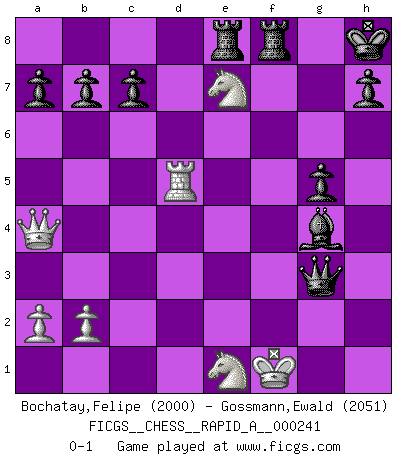 Last move : 0-1 2019 August 4 23:10:25 [Event "FICGS__CHESS__RAPID_A__000241"] [Site "FICGS"] [Date "2019.06.05"] [Round "1"] [White "Bochatay,Felipe"] [Black "Gossmann,Ewald"] [Result "0-1"] [WhiteElo "2000"] [BlackElo "2051"] 1.c4 Nf6 2.g3 e5 3.Bg2 Bc5 4.e3 d5 5.cxd5 Nxd5 6.Nc3 Nb4 7.d4 exd4 8.exd4 Bxd4 9.Qa4+ N8c6 10.Bxc6+ Nxc6 11.Bd2 Bxf2+ 12.Kxf2 Qxd2+ 13.Nge2 O-O 14.Rhd1 Qh6 15.h4 Ne5 16.Nd5 Bg4 17.Ne7+ Kh8 18.Rd5 f6 19.Nf4 Rae8 20.Re1 g5 21.hxg5 Qh2+ 22.Kf1 Qh1+ 23.Kf2 Qf3+ 24.Kg1 Qxg3+ 25.Ng2 Nf3+ 26.Kf1 Nxe1 27.Nxe1 fxg5 0-1 This chess game has been lost on time (started : 2019.06.05 17:56:6) English, 1...Nf6 (Anglo-Indian defense) Kingside Castling by player Black (move 13) Player Black won this chess game. Follow this game move after move (download)The essence of Chess is thinking about what Chess is. (David Bronstein) Die Neutralität betrachte ich als eine schwere Krankheit. (Viktor Kortschnoi) La única cosa que los jugadores de Ajedrez tienen en común, es el Ajedrez. (Lodewijk Prins) Avant la finale, les dieux ont créé le milieu de partie. (Tarrasch) Logic : The art of thinking and reasoning in strict accordance with the limitations and incapacities of the human misunderstanding. (Ambrose Bierce)