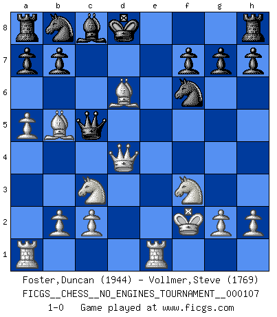 Last move : 1-0 2019 June 30 21:39:6 [Event "FICGS__CHESS__NO_ENGINES_TOURNAMENT__000107"] [Site "FICGS"] [Date "2019.06.08"] [Round "1"] [White "Foster,Duncan"] [Black "Vollmer,Steve"] [Result "1-0"] [WhiteElo "1944"] [BlackElo "1769"] 1.e4 e5 2.f4 exf4 3.Nf3 d5 4.exd5 Qxd5 5.Nc3 Qe6+ 6.Kf2 Nf6 7.Bb5+ Kd8 8.Re1 Qb6+ 9.d4 Bd6 10.a4 c5 11.Bxf4 cxd4 12.a5 Qc7 13.Qxd4 Qc5 14.Bxd6 1-0 KGA : Abbazia defense (Classical defense, Modern defense!) Player White won this chess game. Follow this game move after move (download)Chess, like love, like music, has the power to make people happy. (Siegbert Tarrasch) Schach ist ein Reich, wo sich die menschliche Phantasie frei entfalten kann. (David Bronstein) No todos los artistas son jugadores de Ajedrez, pero todos los jugadores de Ajedrez son artistas. (Marcel Duchamp) Les échecs, c'est la lutte contre l'erreur. (Johannes Zukertort) As the days dwindle down... to a precious few. (Maxwell Anderson)
