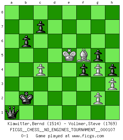 Last move : 0-1 2019 June 25 16:18:21 [Event "FICGS__CHESS__NO_ENGINES_TOURNAMENT__000107"] [Site "FICGS"] [Date "2019.06.08"] [Round "1"] [White "Klawitter,Bernd"] [Black "Vollmer,Steve"] [Result "0-1"] [WhiteElo "1514"] [BlackElo "1769"] 1.b3 e5 2.Bb2 Nc6 3.e3 Nf6 4.Be2 Bc5 5.a3 O-O 6.Nf3 Re8 7.O-O d5 8.d3 d4 9.e4 a5 10.a4 h6 11.h3 Be6 12.Bc1 Nd7 13.Re1 f5 14.Na3 Qf6 15.Bf1 fxe4 16.dxe4 g5 17.Nh2 Kg7 18.Ng4 Qg6 19.Bd3 Rad8 20.f3 Rh8 21.Qe2 Rdf8 22.Nc4 h5 23.Nh2 Nf6 24.Bd2 h4 25.Ng4 Nxg4 26.fxg4 Bxc4 27.bxc4 b6 28.Rf1 Ne7 29.Rxf8 Rxf8 30.Rf1 Rxf1+ 31.Qxf1 Qf6 32.Qxf6+ Kxf6 33.Kf2 Ng6 34.Kf3 Nf4 35.Bxf4 exf4 36.Ke2 Bb4 37.Kf3 Ke6 38.Ke2 Be7 39.Kd2 Bf6 40.Ke2 Kd6 41.Kd1 Kc5 42.Ke2 Kb4 43.e5 Bxe5 44.Kf3 Kxa4 45.Ke4 Kb4 46.Kxe5 a4 47.c3+ Kxc3 48.Bb1 Kb2 49.Bf5 a3 50.Kxd4 a2 51.Ke5 a1Q 0-1 Nimzovich-Larsen attack : Modern variation Kingside Castling by player Black (move 5) Kingside Castling by player White (move 7) Promotion Queen by player Black (move 51) Player Black won this chess game. Follow this game move after move (download)All my games are real. (Bobby Fischer) Ich spiele ehrlich und spiele, um zu gewinnen. Wenn ich verliere nehme ich meine Medizin. (Robert James Fischer) No existe un remordimiento como el remordimiento del Ajedrez. (H. G. Wells) J'ai vu le vaincu d'Echecs jouer des années durant dans l'espoir de la fête de la victoire. Car tu es plus riche de ce qu'elle existe si même elle n'est point pour toi. Ainsi de la perle du fond des mers. (Antoine de Saint-Exupéry) A cynic is a man who knows the price of everything but the value of nothing. (Oscar Wilde)