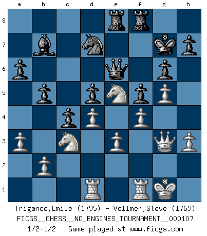 Last move : 1/2-1/2 2019 July 11 7:14:9 [Event "FICGS__CHESS__NO_ENGINES_TOURNAMENT__000107"] [Site "FICGS"] [Date "2019.06.08"] [Round "1"] [White "Trigance,Emile"] [Black "Vollmer,Steve"] [Result "1/2-1/2"] [WhiteElo "1795"] [BlackElo "1769"] 1.c4 Nf6 2.d4 e6 3.Nc3 d5 4.cxd5 exd5 5.Bg5 Nbd7 6.Nf3 Be7 7.e3 O-O 8.Bd3 c6 9.O-O b6 10.Qc2 Bb7 11.h3 Rc8 12.Rfe1 c5 13.Bf5 g6 14.Bxd7 Qxd7 15.Ne5 Qd8 16.Rad1 c4 17.a3 Kg7 18.f4 a6 19.g4 b5 20.Rf1 Nd7 21.Bxe7 Qxe7 22.Qf2 f5 23.Qg3 Rce8 24.g5 Qe6 1/2-1/2 English, 1...Nf6 (Anglo-Indian defense) Kingside Castling by player Black (move 7) Kingside Castling by player White (move 9) This chess game ended in a draw. Follow this game move after move (download)Combinations have always been the most intriguing aspect of Chess. The masters look for them, the public applauds them, the critics praise them. It is because combinations are possible that Chess is more than a lifeless mathematical exercise. They are the poetry of the game; they are to Chess what melody is to music. They represent the triumph of mind over matter. (Reuben Fine) Dein Körper muss in Topform sein. Dein Schach verfällt, wenn dein Körper verfällt. Der Körper kann nicht vom Geist getrennt werden. (Robert James Fischer) Es muy difícil jugar en contra de la teoría de Einstein. - en su primera derrota en contra de Fischer (Mikhail Tal) Les erreurs sont comme les malheurs, elles n'arrivent jamais seules. (Siegbert Tarrasch) Treat your password like your toothbrush. Don't let anybody else use it, and get a new one every six months. (Clifford Stoll)