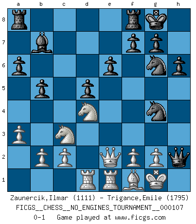 Last move : 0-1 2019 June 30 20:9:43 [Event "FICGS__CHESS__NO_ENGINES_TOURNAMENT__000107"] [Site "FICGS"] [Date "2019.06.08"] [Round "1"] [White "Zaunercik,Ilmar"] [Black "Trigance,Emile"] [Result "0-1"] [WhiteElo "1111"] [BlackElo "1795"] 1.e4 e6 2.d4 d5 3.e5 c5 4.Nf3 Nc6 5.Be2 cxd4 6.Nxd4 Nxe5 7.O-O Nf6 8.Bg5 Be7 9.Re1 O-O 10.Nc3 h6 11.Bh4 Ng6 12.Bg3 a6 13.Bf1 Bb4 14.a3 Bd6 15.Bxd6 Qxd6 16.Qf3 b5 17.Rad1 Bb7 18.Qe3 Ng4 19.Qe2 Qxh2+ 0-1 French : Advance, Nimzovich system Kingside Castling by player White (move 7) Kingside Castling by player Black (move 9) Player Black won this chess game. Follow this game move after move (download)It is not enough to be a good player... you must also play well. (Siegbert Tarrasch) Wenn Dein Gegner dir ein Remis anbietet, versuch herauszufinden, weshalb er glaubt schlechter zu stehen. (Nigel Short) Al jugar al Ajedrez entonces, podemos aprender: Primero: Previsión... Segundo: Prudencia... Tercero: Cautela... Y al final, aprendemos del Ajedrez el hábito de no ser desanimados por apariencias malas presentes en el estado de nuestros asuntos, el hábito de la esperanza por una oportunidad favorable y la perseveración de los secretos de los recursos. (Benjamin Franklin) Le temps de noter son nom sur la feuille de partie, j'étais déjà en zeitnot ! D'un modeste amateur apparié lors de la première ronde d'un open contre le grand-maître Azmaïparashvili. Establishing goals is all right if you don't let them deprive you of interesting detours. (Doug Larson)