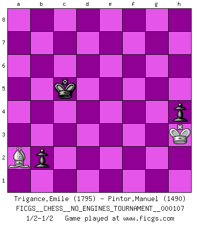 Last move : 1/2-1/2 2019 July 4 8:21:39 [Event "FICGS__CHESS__NO_ENGINES_TOURNAMENT__000107"] [Site "FICGS"] [Date "2019.06.08"] [Round "1"] [White "Trigance,Emile"] [Black "Pintor,Manuel"] [Result "1/2-1/2"] [WhiteElo "1795"] [BlackElo "1490"] 1.a3 e5 2.g3 Bc5 3.Bg2 Nc6 4.Nc3 d6 5.e3 Qf6 6.Na4 Bb6 7.Nxb6 axb6 8.d3 Nh6 9.Ne2 Bg4 10.h3 Bxe2 11.Qxe2 O-O 12.O-O Nf5 13.Bd2 h6 14.Bc3 Nfe7 15.f4 Qg6 16.fxe5 Nxe5 17.g4 c6 18.Rf2 f5 19.Bxe5 dxe5 20.Raf1 fxg4 21.Rxf8+ Rxf8 22.Rxf8+ Kxf8 23.hxg4 b5 24.Qf3+ Kg8 25.Qg3 Nf5 26.Be4 Nxg3 27.Bxg6 Ne2+ 28.Kf2 Nc1 29.Ke1 Na2 30.Bf5 Kf7 31.Bc8 b6 32.Bb7 b4 33.Bxc6 bxa3 34.Bd5+ Kf6 35.Bxa2 axb2 36.d4 exd4 37.exd4 g6 38.c4 h5 39.gxh5 gxh5 40.c5 bxc5 41.dxc5 h4 42.c6 Ke7 43.Kf1 Kd6 44.Kg2 Kxc6 45.Kh3 Kc5 1/2-1/2 Anderssen's Opening Kingside Castling by player Black (move 11) Kingside Castling by player White (move 12) 10 pieces endgame at move 37 : White KBPPP , Black KPPPP WHITE : King + 1 Bishop 3 Pawns BLACK : King + 4 Pawns 9 pieces endgame at move 39 : White KBPPP , Black KPPP WHITE : King + 1 Bishop 3 Pawns BLACK : King + 3 Pawns 8 pieces endgame at move 39 : White KBPP , Black KPPP WHITE : King + 1 Bishop 2 Pawns BLACK : King + 3 Pawns 7 pieces endgame at move 40 : White KBP , Black KPPP WHITE : King + 1 Bishop 1 Pawn BLACK : King + 3 Pawns 6 pieces endgame at move 41 : White KBP , Black KPP WHITE : King + 1 Bishop 1 Pawn BLACK : King + 2 Pawns 5 pieces endgame at move 44 : White KB , Black KPP WHITE : King + 1 Bishop BLACK : King + 2 Pawns This chess game ended in a draw. Follow this game move after move (download)Examine moves that smite! A good eye for smites is far more important than a knowledge of strategical principles. (Purdy) Ich bin es gewohnt, das die Jugend mir überhaupt keinen Respekt entgegenbringt. (Alexander Morozewich) Si tu oponente te ofrece un empate, trata de averiguar porque piensa él que esta en una posición peor. (Nigel Short) J'ai toujours senti une vague pitié pour l'homme qui ne connaît rien aux échecs, tout comme j'en aurais pour un homme ignorant de l'amour. Les Echecs, comme la musique ou comme l'amour, ont le pouvoir de rendre heureux. (Siegbert Tarrasch) Work expands to fill the time available. (C. Northcote Parkinson, in Parkinson's Laws)