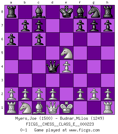 Last move : 0-1 2019 September 1 9:28:19 [Event "FICGS__CHESS__CLASS_E__000223"] [Site "FICGS"] [Date "2019.06.08"] [Round "1"] [White "Myers,Joe"] [Black "Budnar,Milos"] [Result "0-1"] [WhiteElo "1500"] [BlackElo "1249"] 1.e4 e5 2.Nf3 Nc6 3.Bb5 a6 4.Bxc6 dxc6 5.Nxe5 Qd4 0-1 This chess game has been lost on time (started : 2019.06.08 20:25:14) Ruy Lopez : Exchange variation Player Black won this chess game. Follow this game move after move (download)During a Chess competition a Chessmaster should be a combination of a beast of prey and a monk. (Alexander Alekhine) Ich verstehe den Grund nicht, warum die Aufteilung in Frauen und Männer überhaupt im Schach besteht. (Judith Polgar) No es tiempo de jugar al Ajedrez cuando la casa esta en llamas. (Proverbio Italiano) Les sacrifices démontrent seulement que quelqu'un a gaffé. (Savielly Tartacover) How many people work in NATO Headquarters ? - About half of them. (Dirk Stikker, NATO general secretary)