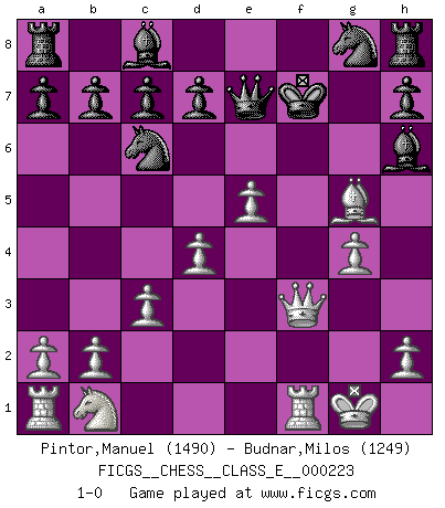 Last move : 1-0 2019 August 19 17:17:50 [Event "FICGS__CHESS__CLASS_E__000223"] [Site "FICGS"] [Date "2019.06.08"] [Round "1"] [White "Pintor,Manuel"] [Black "Budnar,Milos"] [Result "1-0"] [WhiteElo "1490"] [BlackElo "1249"] 1.e4 e5 2.f4 exf4 3.Nf3 g5 4.Bc4 g4 5.O-O gxf3 6.Qxf3 Qf6 7.c3 Nc6 8.d4 Bh6 9.e5 Qf5 10.g4 Qg5 11.Bxf7+ Kxf7 12.Bxf4 Qe7 13.Bg5 1-0 KGA : Muzio gambit Kingside Castling by player White (move 5) Player White won this chess game. Follow this game move after move (download)No price is too great for the scalp of the enemy King. (Koblentz) Der Partner hat auch seine Existenzberechtigung. (Savielly Grigorievitsch Tartakower) Juega la Apertura como un libro, el Juego Medio como un mago y los Finales como una máquina. (Spielmann) Je menace de comprendre la position. (Anonyme) Kids, you tried your best and you failed miserably. The lesson is, never try. (Simpsons)