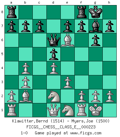 Last move : 1-0 2019 August 30 4:42:45 [Event "FICGS__CHESS__CLASS_E__000223"] [Site "FICGS"] [Date "2019.06.08"] [Round "1"] [White "Klawitter,Bernd"] [Black "Myers,Joe"] [Result "1-0"] [WhiteElo "1514"] [BlackElo "1500"] 1.d4 d5 2.Nf3 g6 3.e3 Bg7 4.b3 Nf6 5.Bb2 Bf5 6.Nbd2 O-O 7.Be2 Nc6 8.O-O Nb4 9.Ne1 Qd7 10.c3 Ng4 11.cxb4 Qd6 12.Bxg4 Be6 13.Bxe6 1-0 This chess game has been lost on time (started : 2019.06.08 20:25:14) Queen's pawn game Kingside Castling by player Black (move 6) Kingside Castling by player White (move 8) Player White won this chess game. Follow this game move after move (download)A good sacrifice is one that is not necessarily sound but leaves your opponent dazed and confused. (Rudolph Spielmann) Bis jetzt ist Weiß einer wohlbekannten Analyse gefolgt. Aber jetzt begeht er einen schrecklichen Fehler: Er beginnt seinen eigenen Kopf zu benutzen. (Siegbert Tarrasch) Los errores estan ahí, esperando a que se cometan. (Savielly Tartakower) Pour se monter efficace, un Cavalier a besoin d'avant-postes ! Les Cavaliers font les meilleurs bloqueurs de pions passés. Employ the attack like tactic of defense. (Chinese proverb)