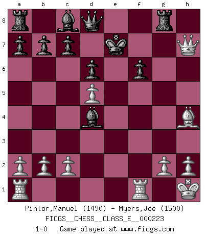 Last move : 1-0 2019 September 3 12:40:38 [Event "FICGS__CHESS__CLASS_E__000223"] [Site "FICGS"] [Date "2019.06.08"] [Round "1"] [White "Pintor,Manuel"] [Black "Myers,Joe"] [Result "1-0"] [WhiteElo "1490"] [BlackElo "1500"] 1.e4 e5 2.f4 Nc6 3.Nf3 Nf6 4.Nc3 Bc5 5.fxe5 Ng4 6.d4 Bb6 7.Bg5 f6 8.exf6 gxf6 9.Bh4 d6 10.Bc4 Ne3 11.Qe2 Nxc4 12.O-O Nxd4 13.Nxd4 Bxd4+ 14.Kh1 Ne3 15.Qh5+ Ke7 16.Nd5+ Nxd5 17.exd5 Rg8 18.Qxh7+ 1-0 This chess game has been lost on time (started : 2019.06.08 20:25:14) King's gambit Kingside Castling by player White (move 12) Player White won this chess game. Follow this game move after move (download)The blunders are all there on the board, waiting to be made. (Savielly Tartakover) Ein Teil des Fehlers ist immer korrekt. (Savielly Grigorievitsch Tartakower) El Ajedrez te enseña a controlarl la excitación inicial que sientes cuando vez algo que parece bueno y te enseña a pensar objetivamente cuando te encuentras en problemas. (Stanley Kubrick) Le profane ne songe pas à la somme de jouissance dont il se prive, qui méconnaît ce jeu aux ressources aussi variées que passionnantes. (Jean-Marie Jeanton-Lamarche) No enterprise is more likely to succeed than one concealed from the enemy until it is ripe for execution. (Niccolo Machiavelli)