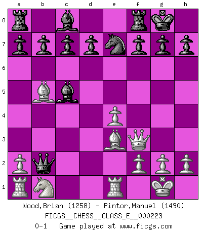 Last move : 0-1 2019 July 8 21:28:20 [Event "FICGS__CHESS__CLASS_E__000223"] [Site "FICGS"] [Date "2019.06.08"] [Round "1"] [White "Wood,Brian"] [Black "Pintor,Manuel"] [Result "0-1"] [WhiteElo "1258"] [BlackElo "1490"] 1.e4 e5 2.Nf3 Nc6 3.Bb5 Qf6 4.O-O Bc5 5.c3 Nge7 6.Re1 O-O 7.d4 exd4 8.cxd4 Nxd4 9.Be3 Nxf3+ 10.Qxf3 Qxb2 0-1 Ruy Lopez (Spanish Opening) Kingside Castling by player White (move 4) Kingside Castling by player Black (move 6) Player Black won this chess game. Follow this game move after move (download)All I want to do, ever, is just play Chess. (Bobby Fischer) Schach ist das Spiel, das die Verrückten gesund hält. (Albert Einstein) De eso se trata el Ajedrez. Un día le das una lección a tu oponente y al día siguiente el te da una a tí. (Bobby Fischer) Je crois qu'il existe des manières très spécifiques de jouer efficacement contre une machine. Evidemment, nous n'avons aucune chance en technique pure, parce que l'ordinateur calcule de manière parfaite. Mais lorsque nous faisons appel à notre cerveau, en utilisant l'intuition et la compréhension, alors nous restons beaucoup plus forts. (Anatoli Karpov) Panic is a sudden desertion of us, an a going over to the enemy of our imagination. (Christian Nevell Bovee)