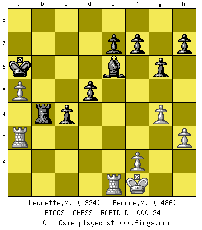 Last move : 1-0 2019 August 18 7:59:57 [Event "FICGS__CHESS__RAPID_D__000124"] [Site "FICGS"] [Date "2019.06.08"] [Round "1"] [White "Leurette,Marc-Antoine"] [Black "Benone,Mateia"] [Result "1-0"] [WhiteElo "1324"] [BlackElo "1486"] 1.e4 c5 2.d4 cxd4 3.c3 dxc3 4.Nxc3 Nc6 5.Nf3 Nf6 6.e5 Ng4 7.Bf4 Qa5 8.h3 Ngxe5 9.Nxe5 Nxe5 10.Qd5 Nc6 11.Qxa5 Nxa5 12.Nd5 d6 13.Nc7+ Kd8 14.Nxa8 Nc6 15.Bb5 Bd7 16.Be3 Kc8 17.Bxc6 bxc6 18.Bxa7 Kb7 19.Be3 Kxa8 20.O-O Kb7 21.a4 g6 22.a5 Ka6 23.Rfb1 Bg7 24.Ra3 Rb8 25.b4 c5 26.Bd2 Bd4 27.Bc3 Bxc3 28.Rxc3 Rxb4 29.Re1 Be6 30.Ra3 c4 31.Kf1 d5 32.g4 1-0 This chess game has been lost on time (started : 2019.06.08 20:26:1) Sicilian : Smith-Morra gambit Kingside Castling by player White (move 20) Player White won this chess game. Follow this game move after move (download)It is no time to be playing Chess when the house is on fire. (Italian Proverb) Taktik ist was man tun muß, wenn etwas zu tun ist. Strategie ist was man tun muß, wenn nichts zu tun ist. (Savielly Grigorievitsch Tartakower) Tu cuerpo tiene que estar en óptima condición. Tu Ajedrez se deteriora como lo hace tu cuerpo. No puedes separar la mente y el cuerpo. (Bobby Fischer) Les Echecs, c'est l'art de la guerre sans les charniers, c'est la résurrection des morts tombés au champ d'honneur, l'espoir perpétuel, la suprématie de l'intelligence sur la force, la culture de l'esprit. (F. Szpiner) If you ain't just a little scared when you enter a casino, you are either very rich or you haven't studied the games enough. (Pappy)