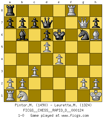 Last move : 1-0 2019 June 15 5:53:50 [Event "FICGS__CHESS__RAPID_D__000124"] [Site "FICGS"] [Date "2019.06.08"] [Round "1"] [White "Pintor,Manuel"] [Black "Leurette,Marc-Antoine"] [Result "1-0"] [WhiteElo "1490"] [BlackElo "1324"] 1.e4 e5 2.f4 Bc5 3.Nf3 exf4 4.Bc4 d6 5.d4 Bb6 6.Bxf4 Ne7 7.O-O Nbc6 8.c3 Bg4 9.Bxf7+ Kxf7 10.Ng5+ Ke8 11.Qxg4 Qd7 12.Ne6 Rg8 13.Kh1 Nd8 14.Nxg7+ Rxg7 15.Qxg7 Ne6 16.Qh8+ Nf8 17.Bh6 Neg6 18.Rxf8+ Ke7 19.Qg7+ Ke6 20.d5+ 1-0 KGD : Classical variation Kingside Castling by player White (move 7) Player White won this chess game. Follow this game move after move (download)A passed Pawn increases in strength as the number of pieces on the board diminishes. (Capablanca) Dass jemand wie Surab Asmaiparaschwili, der selbst Elopunkte gekauft hat , Vize-Präsident der Fide werden konnte, sagt schon einges über den Zustand dieser Organisation aus. (Joel Lautier) Una buena memoria, concentración, imaginación y una fuerte voluntad, se requiere para llegar a ser un buen jugador. (Bobby Fischer) Roi des jeux et jeu des rois, les échecs portent en eux un sentiment d'infini. Ils donnent à celui qui s'est efforcé d'en approfondir les arcanes l'impression de n'être pas à la mesure de l'homme; en fait, ils constituent un résumé de l'univers, un microcosme, et figurent cette grande échelle qui, dans les plans de la lumière descend jusqu'à la matière, qui des abîmes insondables remonte jusqu'en l'infini de Dieu. (Pyrame) A good aphorism is too hard for the tooth of time, and is not worn away with the centuries, although it serves as food for every speech. (Friedrich Nietzsche)