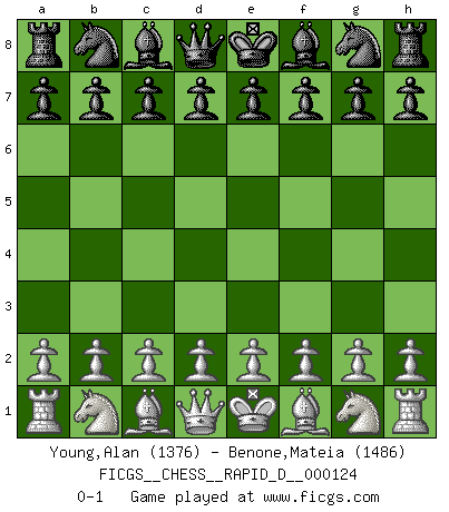 Last move : 0-1 2019 July 9 0:0:20 [Event "FICGS__CHESS__RAPID_D__000124"] [Site "FICGS"] [Date "2019.06.08"] [Round "1"] [White "Young,Alan"] [Black "Benone,Mateia"] [Result "0-1"] [WhiteElo "1376"] [BlackElo "1486"] 0-1 This chess game has been lost on time (started : 2019.06.08 20:26:1) Player Black won this chess game. Follow this game move after move (download)After a bad opening, there is hope for the middle game. After a bad middle game, there is hope for the endgame. But once you are in the endgame, the moment of truth has arrived. (Edmar Mednis) Schach wird sich dank seiner hohen kulturellen Tradition immer durchsetzen. In näherer Zukunft womöglich sogar als Gegenreaktion auf die maßlose Reizüberflutung im Freizeit- und Spielbereich. (Garry Kasparov) El Ajedrez es como la guerra en un tablero. (Bobby Fischer) On peut tirer plus d'utilité d'une partie perdue que de 100 parties gagnées. (Capablanca) A computer lets you make more mistakes faster than any invention in human history - with the possible exceptions of handguns and tequila. (Mitch Ratcliffe)