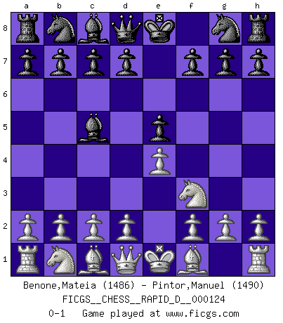Last move : 0-1 2019 July 11 15:30:17 [Event "FICGS__CHESS__RAPID_D__000124"] [Site "FICGS"] [Date "2019.06.08"] [Round "1"] [White "Benone,Mateia"] [Black "Pintor,Manuel"] [Result "0-1"] [WhiteElo "1486"] [BlackElo "1490"] 1.e4 e5 2.Nf3 Bc5 0-1 This chess game has been lost on time (started : 2019.06.08 20:26:1) King's knight Opening Player Black won this chess game. Follow this game move after move (download)Blessed be the memory of him who gave the world this immortal game. (A. G. Gardiner) Ich bin Weltmeister und muß mit niemandem irgend etwas diskutieren. (Viswanathan Anand) Te sientas frente a un tablero y repentinamente tu corazón brinca. Tu mano tiembla al tomar una pieza y moverla. Pero lo que el Ajedrez te enseña es que tu debes permanecer ahí con calma y pensar de que si realmente es una buena idea o de que si hay otras ideas mejores. (Stanley Kubrick) RxDa4 pat (...) He who fights with monsters should be careful lest he thereby become a monster. (Friedrich Nietzsche, Beyond Good and Evil)