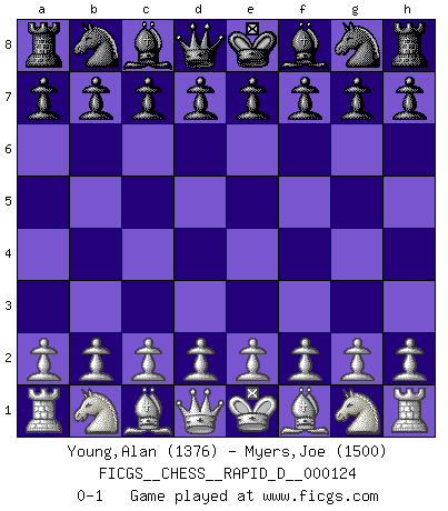 Last move : 0-1 2019 July 9 0:0:20 [Event "FICGS__CHESS__RAPID_D__000124"] [Site "FICGS"] [Date "2019.06.08"] [Round "1"] [White "Young,Alan"] [Black "Myers,Joe"] [Result "0-1"] [WhiteElo "1376"] [BlackElo "1500"] 0-1 This chess game has been lost on time (started : 2019.06.08 20:26:1) Player Black won this chess game. Follow this game move after move (download)It began to feel as though you were playing against Chess itself. - On playing against Robert Fischer. (Walter Shipman) Ich habe die Schachforschung dermaßen betrieben, dass sie auf eine wissenschaftliche Basis gestellt wurde. (Mikhail Moiseyevich Botvinik) Tu cuerpo tiene que estar en óptima condición. Tu Ajedrez se deteriora como lo hace tu cuerpo. No puedes separar la mente y el cuerpo. (Bobby Fischer) Le système Elo représente seulement une moyenne. Il est simplement un indicateur de votre stabilité. (Anatoli Karpov) You have to believe in yourself. (Sun Tzu)
