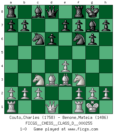Last move : 1-0 2019 August 17 18:50:13 [Event "FICGS__CHESS__CLASS_D__000255"] [Site "FICGS"] [Date "2019.06.09"] [Round "1"] [White "Couto,Charles"] [Black "Benone,Mateia"] [Result "1-0"] [WhiteElo "1758"] [BlackElo "1486"] 1.e4 c5 2.d4 cxd4 3.Qxd4 Nc6 4.Qd1 Nf6 5.Nc3 g6 6.Be3 Bg7 7.Nf3 O-O 8.Bd3 d6 9.O-O 1-0 This chess game has been lost on time (started : 2019.06.09 8:50:48) Sicilian : Smith-Morra gambit Kingside Castling by player Black (move 7) Kingside Castling by player White (move 9) Player White won this chess game. Follow this game move after move (download)To avoid losing a piece, many a person has lost the game. (Savielly Tartakover) Schach ist das schnellste Spiel der Welt, weil man in jeder Sekunde Tausende von Gedanken ordnen muß. (Albert Einstein) El Ajedrez se juega con la mente... ¡no con las manos!. (Renaud y Kahn) Des combinaisons [dans le jeu d'échecs] pareilles à des mélodies. Je crois entendre pour ainsi dire la musique des coups... (Vladimir Nabokov) The various flowers seem good to different people. (Chinese proverb)