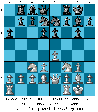 Last move : 0-1 2019 July 20 23:55:41 [Event "FICGS__CHESS__CLASS_D__000255"] [Site "FICGS"] [Date "2019.06.09"] [Round "1"] [White "Benone,Mateia"] [Black "Klawitter,Bernd"] [Result "0-1"] [WhiteElo "1486"] [BlackElo "1514"] 1.e4 e6 2.d3 d6 3.Nf3 g6 4.g3 Bg7 5.Bg2 Nd7 6.O-O Ne7 7.Nc3 O-O 8.Bd2 a6 9.Qe2 Rb8 0-1 This chess game has been lost on time (started : 2019.06.09 8:50:48) French : King's Indian attack Kingside Castling by player White (move 6) Kingside Castling by player Black (move 7) Player Black won this chess game. Follow this game move after move (download)You are for me the Queen on d8 and I am the Pawn on d7 !! (Eduard Gufeld) Ein Teil des Fehlers ist immer korrekt. (Savielly Grigorievitsch Tartakower) La vida es como el Ajedrez, con lucha, competición y eventos buenos y malos. (Benjamin Franklin) Shah mat. Le roi est mort. Cri de fierté d'un joueur venant de terrasser son adversaire, courtoisement, sans effusion de sang. The worth of a book is to be measured by what you can carry away from it. (James Bryce)