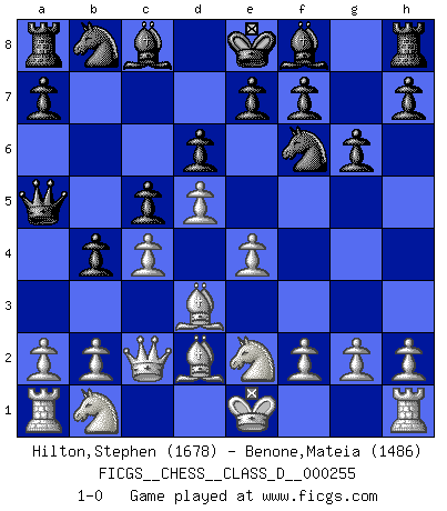Last move : 1-0 2019 July 20 23:55:41 [Event "FICGS__CHESS__CLASS_D__000255"] [Site "FICGS"] [Date "2019.06.09"] [Round "1"] [White "Hilton,Stephen"] [Black "Benone,Mateia"] [Result "1-0"] [WhiteElo "1678"] [BlackElo "1486"] 1.d4 Nf6 2.c4 c5 3.d5 b5 4.Qc2 Qa5+ 5.Bd2 b4 6.e4 d6 7.Bd3 g6 8.Ne2 1-0 This chess game has been lost on time (started : 2019.06.09 8:50:48) Benko gambit Player White won this chess game. Follow this game move after move (download)I'd rather have a Pawn than a finger. (Reuben Fine) Es war undenkbar für die Behörden, dass ein sowjetischer Großmeister auf diese Art und Weise [Fischer-Taimanov 6:0] verliert, ohne dass es eine politischer Erklärung dafür gäbe. (Mark Taimanov) Realmente no sabemos como el juego fue inventado, aunque hay sospechas. Tan pronto como descubramos a los culpables, se los haremos saber. (Bruce Pandolfini) Tous ces prétendus hommes politiques sont les pions, les Cavaliers, les Tours ou les Fous d'une partie d'échecs qui se jouera tant qu'un hasard ne renversera pas l'échiquier. (Honoré de Balzac) He who is a good ruler must first have been ruled. (Aristotle)