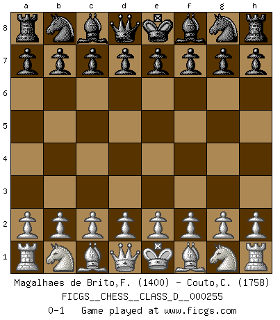 Last move : 0-1 2019 July 19 10:5:39 [Event "FICGS__CHESS__CLASS_D__000255"] [Site "FICGS"] [Date "2019.06.09"] [Round "1"] [White "Magalhaes de Brito,Francisco dieles"] [Black "Couto,Charles"] [Result "0-1"] [WhiteElo "1400"] [BlackElo "1758"] 0-1 This chess game has been lost on time (started : 2019.06.09 8:50:48) Player Black won this chess game. Follow this game move after move (download)I give 98 percent of my mental energy to Chess. Others give only 2 percent. (Bobby Fischer) Wie bekannt hörte Morphy 1859 auf, Schach zu spielen. Seine Enttäuschung galt nicht so sehr dem Schach, wie den Schachspielern. (Robert James Fischer) El Ajedrez es tan interesante por sí solo, que no es necesario un interés monetario para persuadir a una persona a que lo practique; por lo tanto, nunca se juega por dinero. (Benjamin Franklin) La conception d'un plan est le processus par lequel un joueur exploite les avantages de sa position tout en s'efforçant d'en réduire au minimum les inconvénients. Afin de garantir le succès, un plan doit toujours se fonder sur un diagnostic objectif des particularités d'une position. La conception d'un plan est d'autant plus difficile que la position est équilibrée, et grandement facilitée lorsqu'il n'existe qu'un seul plan susceptible de répondre aux exigences de la position. (Harry Golombek) Hardware: the parts of a computer that can be kicked. (Jeff Persis)