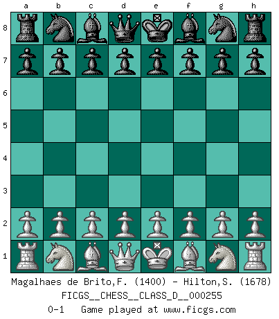 Last move : 0-1 2019 July 19 10:5:39 [Event "FICGS__CHESS__CLASS_D__000255"] [Site "FICGS"] [Date "2019.06.09"] [Round "1"] [White "Magalhaes de Brito,Francisco dieles"] [Black "Hilton,Stephen"] [Result "0-1"] [WhiteElo "1400"] [BlackElo "1678"] 0-1 This chess game has been lost on time (started : 2019.06.09 8:50:48) Player Black won this chess game. Follow this game move after move (download)We like to think. (Gary Kasparov) Schach ist das Spiel, das die Verrückten gesund hält. (Albert Einstein) El Peón aislado arroja penumbra sobre todo el tablero. (Aaron Nimzovich) Les écrivains ont utilisé les échecs pour analyser les côtés extrêmes de la nature humaine. Dans ce cadre, les échecs offrent un champ d'expérimentation idéal. Mais on pourrait faire la même chose avec la peinture. Et là, en vous référant à Van Gogh, vous ne tirerez pas de conclusion définitive sur les peintres. (Gary Kasparov) As a goal marker shodan is important. As a destination it is a poor place to stop. (Thomas Tamayo)