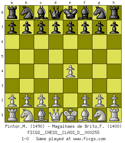 Last move : 1-0 2019 July 20 11:47:12 [Event "FICGS__CHESS__CLASS_D__000255"] [Site "FICGS"] [Date "2019.06.09"] [Round "1"] [White "Pintor,Manuel"] [Black "Magalhaes de Brito,Francisco dieles"] [Result "1-0"] [WhiteElo "1490"] [BlackElo "1400"] 1.e4 1-0 This chess game has been lost on time (started : 2019.06.09 8:50:48) King's pawn Opening Player White won this chess game. Follow this game move after move (download)That's what Chess is all about. One day you give your opponent a lesson, the next day he gives you one. (Bobby Fischer) Jede Eröffnung ist gut genug um gespielt zu werden, wenn nur ihr Ruf schlecht genug ist. (Savielly Grigorievitsch Tartakower) Yo he agregado estos principios a la ley: pongan los Caballos en acción antes de que los dos Alfiles sean desarrollados. (Emanuel Lasker) Il a essayé de se convaincre qu'il pourrait empêcher toutes les erreurs et ne jamais perdre. L'horreur ! Gary Kasparov au sujet de Robert Fischer. Without enthusiasm, virtue functions not at all, and vice only poorly. (Mignon McLaughlin, The Neurotic's Notebook, 1960)